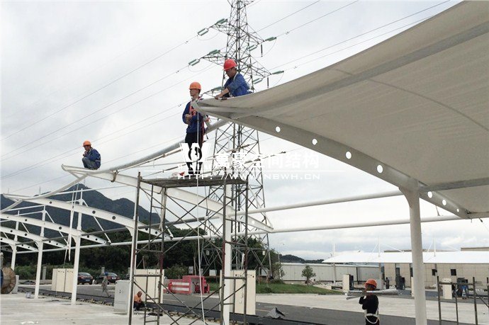 膜結構雨棚施工面積約5138平方;用鋼量約80噸。施工難點在于工期緊。施工時天氣情況差,連續的陰雨天給鋼構的油漆施工帶來了極大的麻煩并且延誤了工期。雨棚底下還要安裝充電樁,我們還要和充電樁施工班組進行技術對接,規劃充電樁的安裝位置。由于工期緊,天氣狀況差,我們動用了兩個施工班組加班加點,土建、鋼構交叉施工,最后如期完工。由于每個雨棚長度比較長,施工班組在立好鋼構件之后從中間開始往兩邊安裝膜布,使工作效率有了很大的提高。