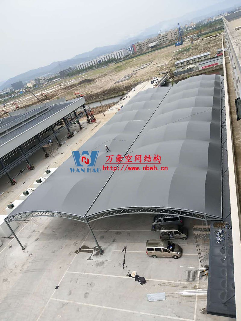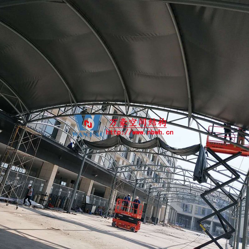 奉化方橋農副鋼膜結構雨棚工程位于浙江省寧波市奉化市內,此工程用鋼量100噸,膜結構展開面積3500平米,由寧波萬豪空間結構工程有限公司承建。