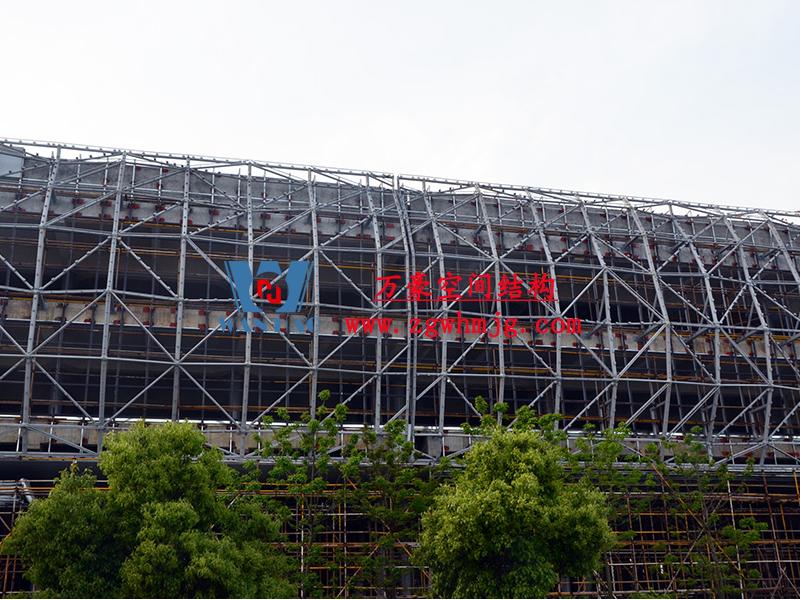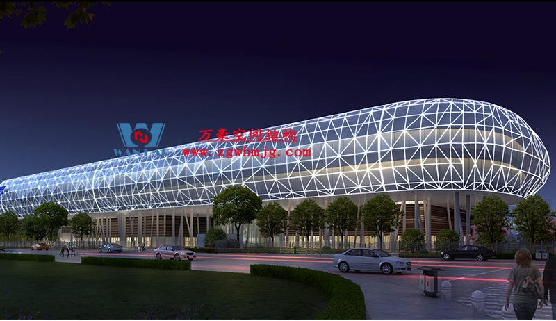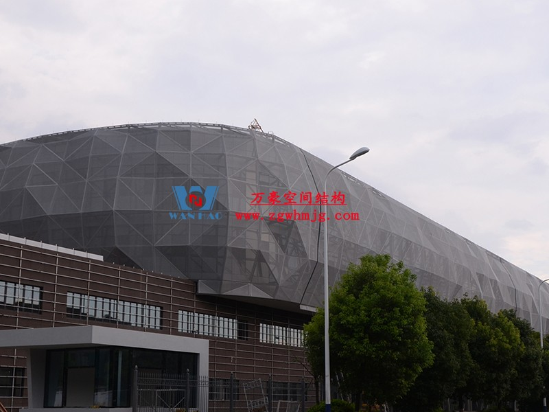 寧波菲仕展廳外立面網格膜結構項目,方案由意大利著名建筑師設計,設計靈感取鉆石之意。為了實現多變的設計效果,整個外立面采用了8000根形狀各異的鋼構件,每根桿件單獨編號、定位,實施難度極大。外層使用PTFE網格膜,樹立了PTFE網格膜使用的新標桿。用鋼量880噸,PTFE膜展開面積12660平方。