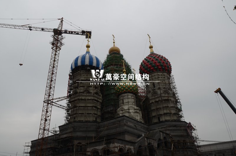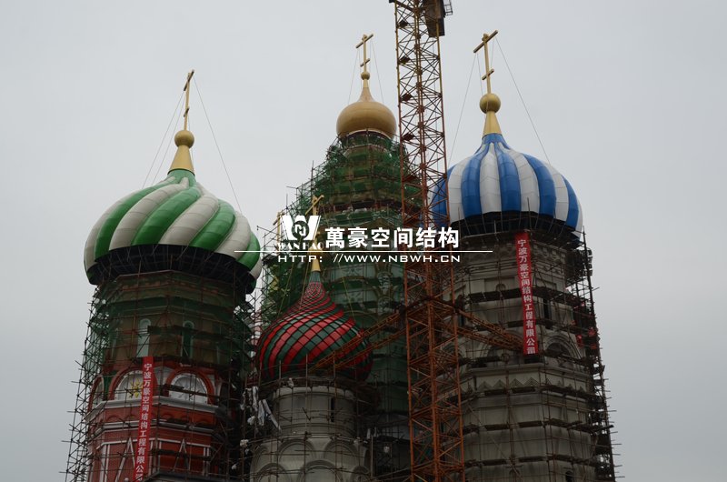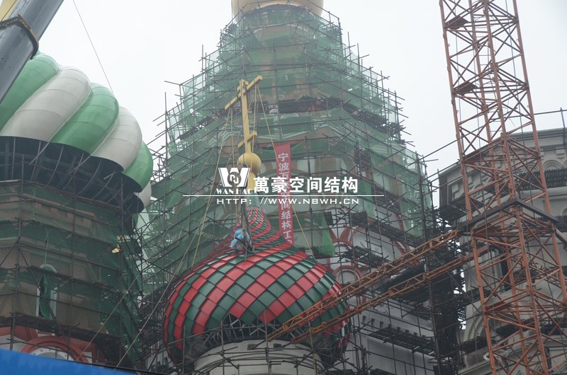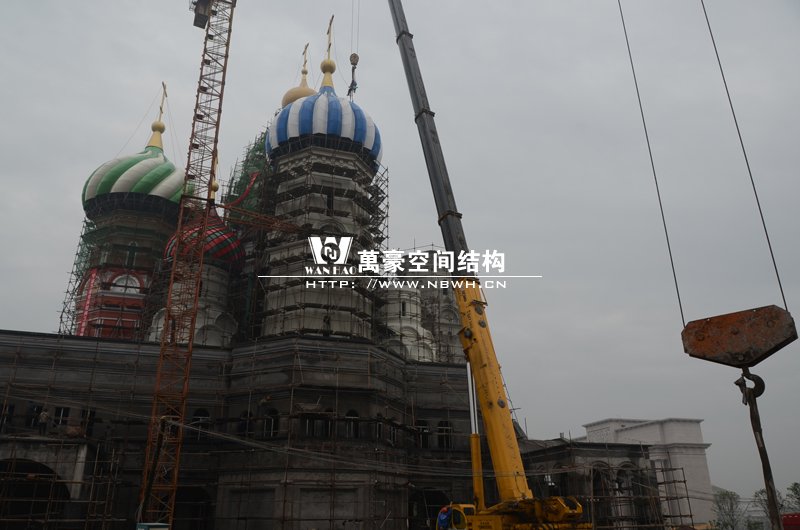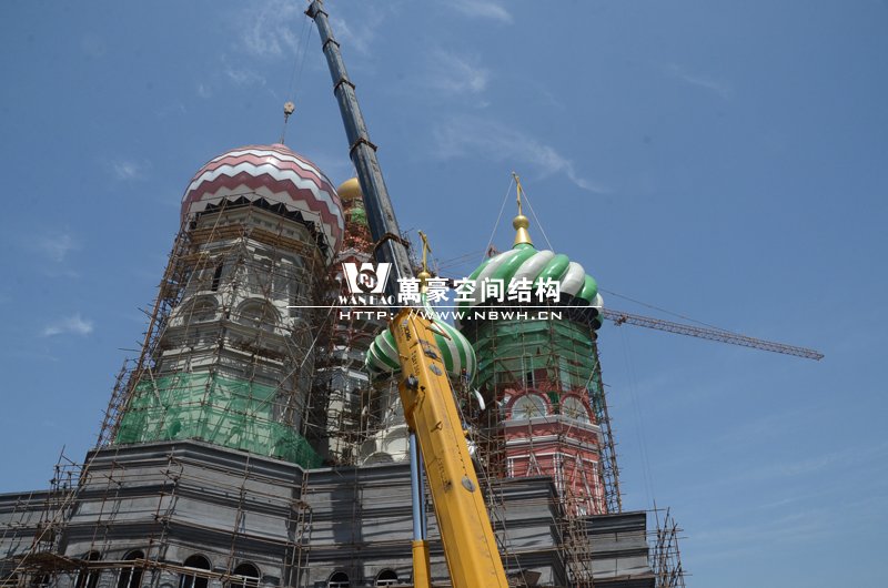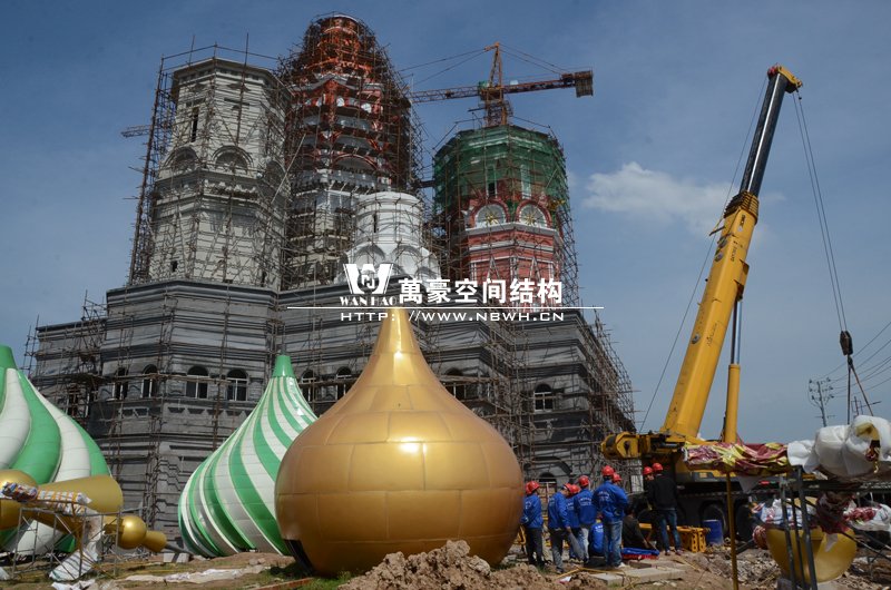 橫店影視城俄羅斯館屋頂鋼結(jié)構(gòu)裝飾球吊裝完成,本次吊裝的九個(gè)裝飾采用鋼結(jié)構(gòu)骨架、鋁合金外殼,最重的裝飾球達(dá)20來噸,采用300多噸的大吊車進(jìn)行吊裝。