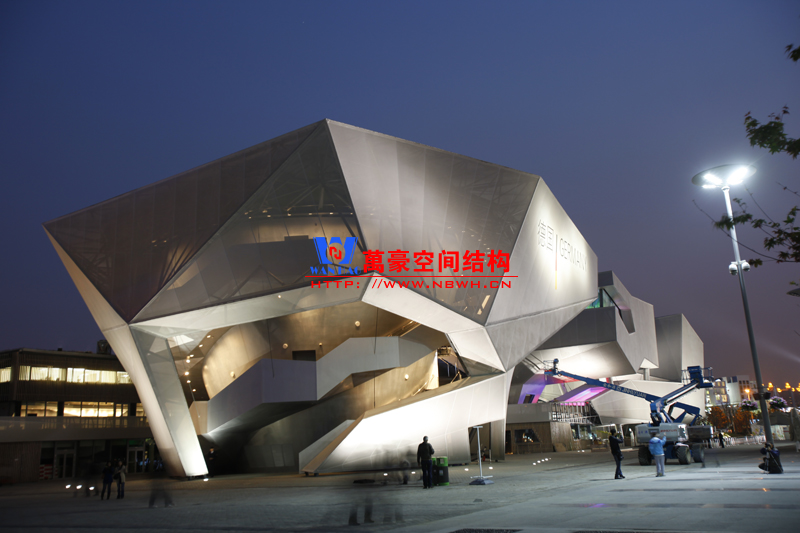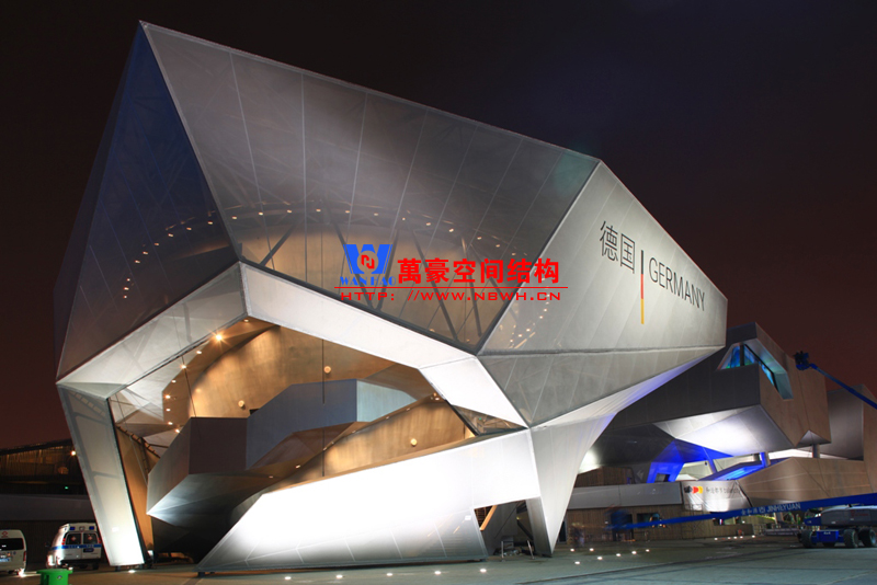 世博會(huì)德國(guó)館膜結(jié)構(gòu)建筑建成于2009年7月,于2010年在中國(guó)上海世博會(huì)上正式投入使用,是中國(guó)國(guó)內(nèi)經(jīng)典膜結(jié)構(gòu)建筑之一。德國(guó)館位于盧浦大橋附近的黃浦江南岸,與瑞士、法國(guó)和波蘭館相鄰,占地面積6000平方米。由于膜結(jié)構(gòu)材料的特殊屬性,可以讓德國(guó)館的形態(tài)呈不規(guī)則狀,十分的別致。展館四面呈開(kāi)放狀,其建筑設(shè)計(jì)給人一種輕盈、飄逸的感覺(jué),又像是在邀人同游。德國(guó)館的建筑體外部由一層透明的銀色發(fā)光建筑膜結(jié)構(gòu)包裝起來(lái),展館的四大建筑主體懸架于和諧都市展廳入口所在的底層區(qū)域。