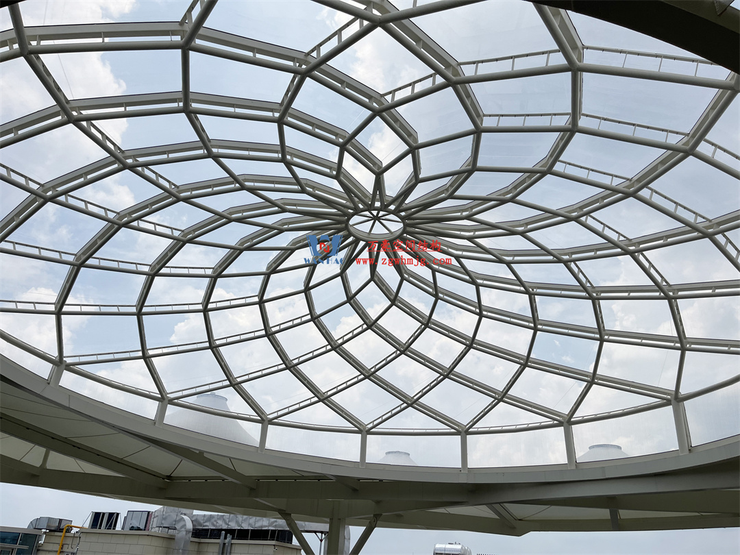 3、適應大跨度:膜結(jié)構(gòu)材質(zhì)輕,適合大跨度的建筑設(shè)計。在大型商業(yè)街區(qū)中,常常需要建造開闊的空間,膜結(jié)構(gòu)穹頂能夠輕松滿足這一需求,無需過多的支撐結(jié)構(gòu),使空間更加開闊、通透。