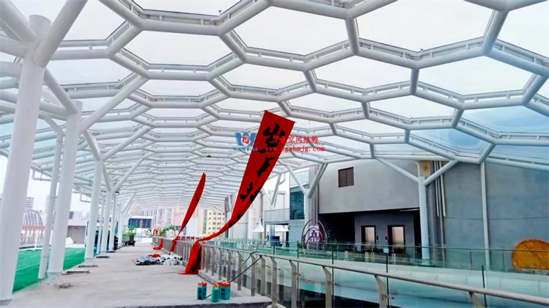廣州茂名總匯天街商業(yè)街ETFE膜結(jié)構(gòu)工程地處電白市區(qū)繁華CBD路段,毗鄰電白萬達(dá)廣場,2萬平方城市購物中心化商業(yè)街區(qū),配套星級酒店及地下智能停車場。該項(xiàng)目ETFE膜結(jié)構(gòu)展開面積約為2000平方米。