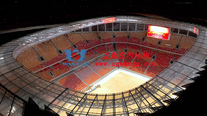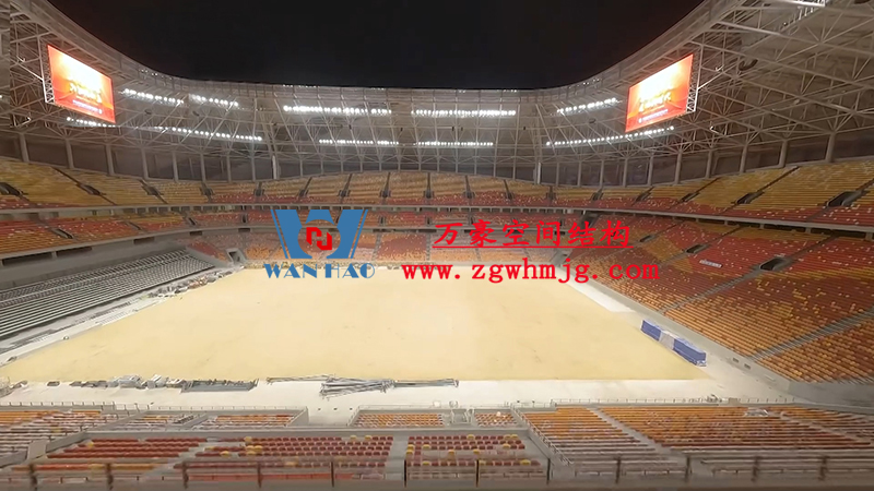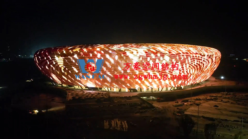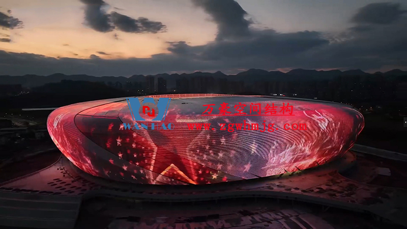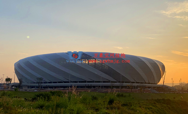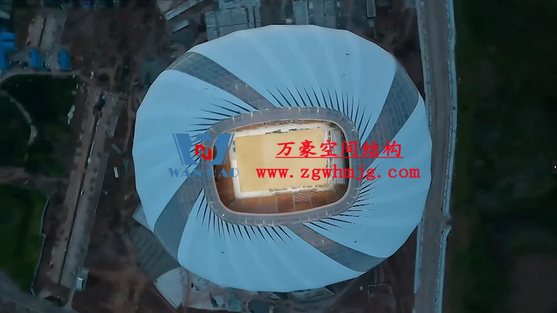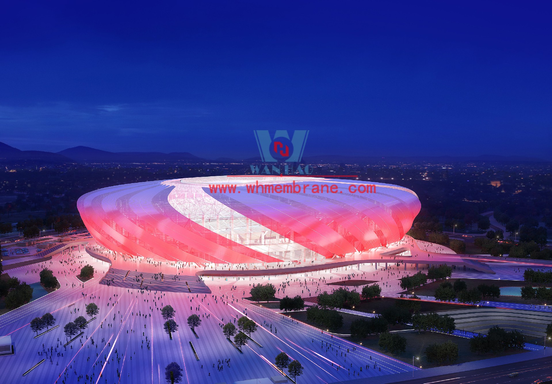重慶龍興足球場項目位于重慶市兩江新區,占地面積約303畝,總建筑面積約17萬平方米。足球場鋼屋蓋平面呈橢圓形,南北投影長283米、東西寬252米,屋面最大高度59.5米。該項目部分屋面材料選用進口高自潔ETFE膜材, 膜結構展開面積合計30000平米。