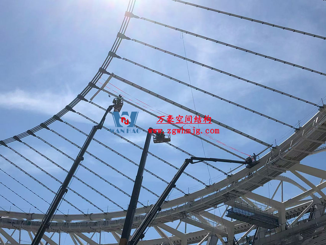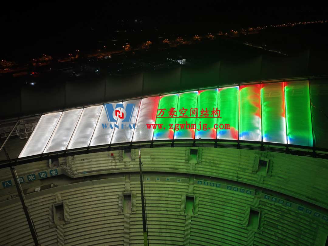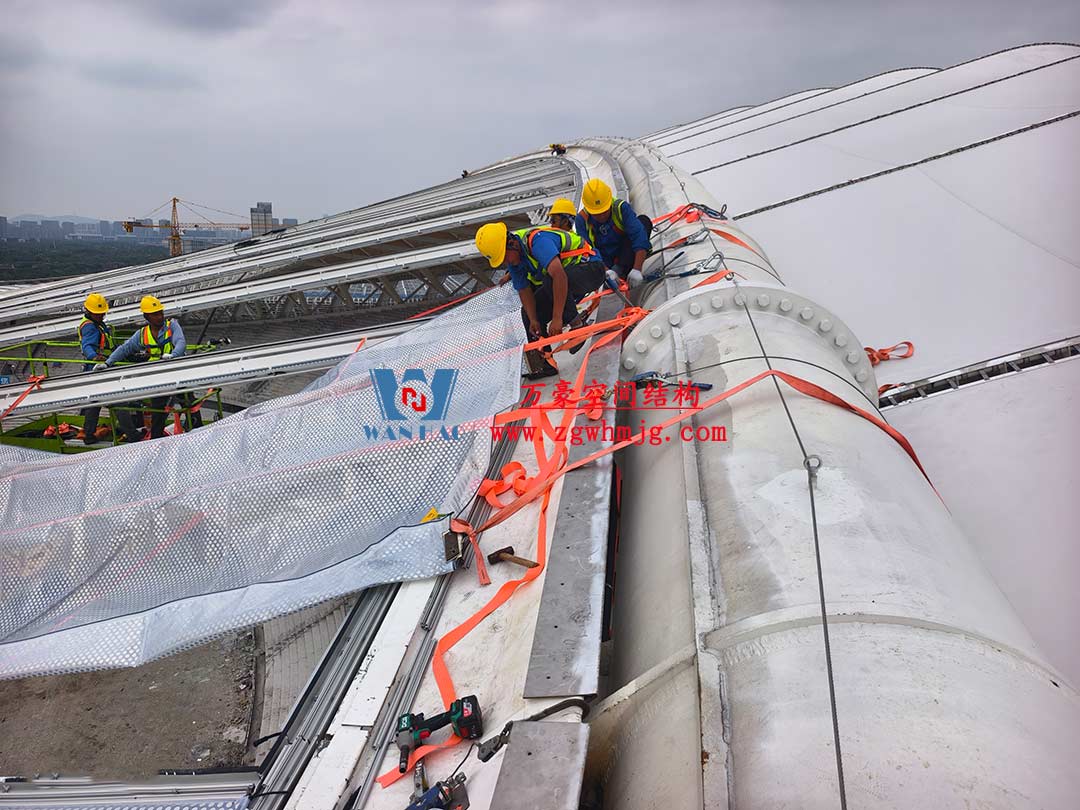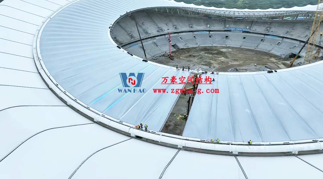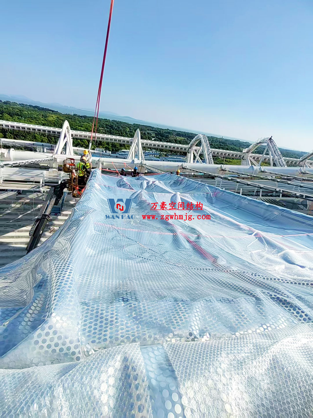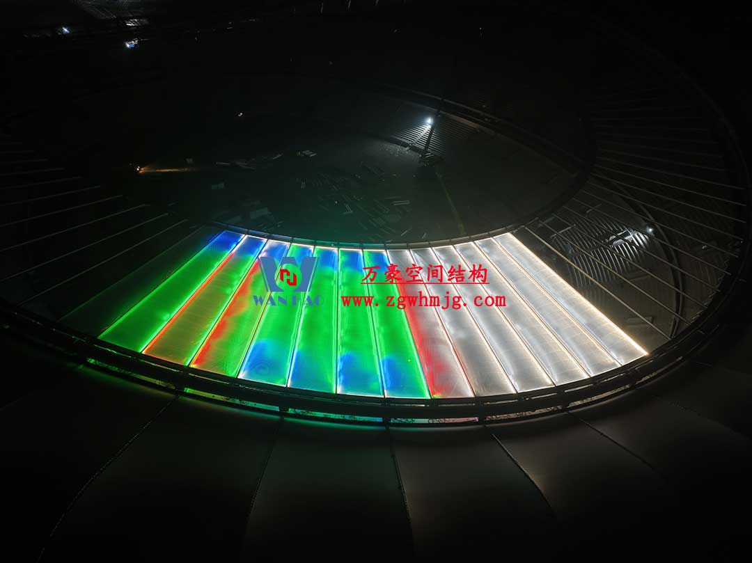 該項目采用車輻式索膜結構體系,其中膜結構由屋面內環ETFE氣枕結構、屋面外環PTFE膜結構及立面PTFE膜結構組成。 其中,屋面ETFE氣枕由萬豪空間結構深化設計及安裝,ETFE氣枕投影面積20000平方米左右。