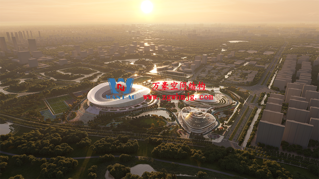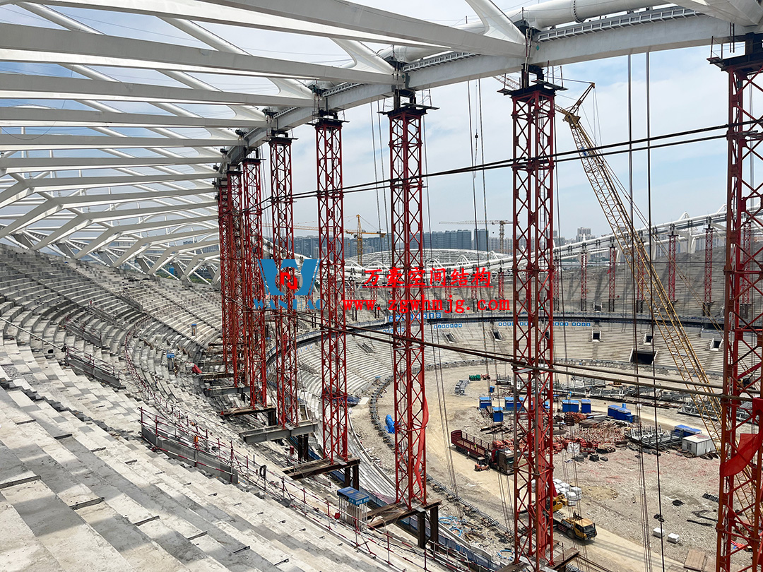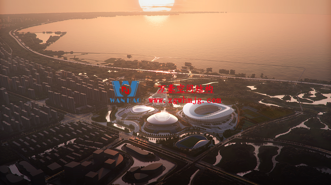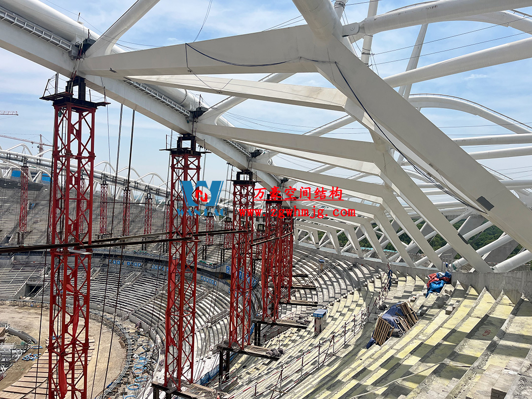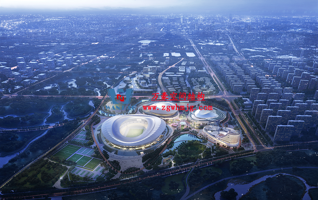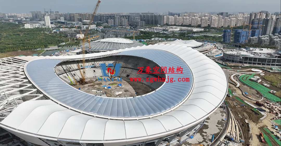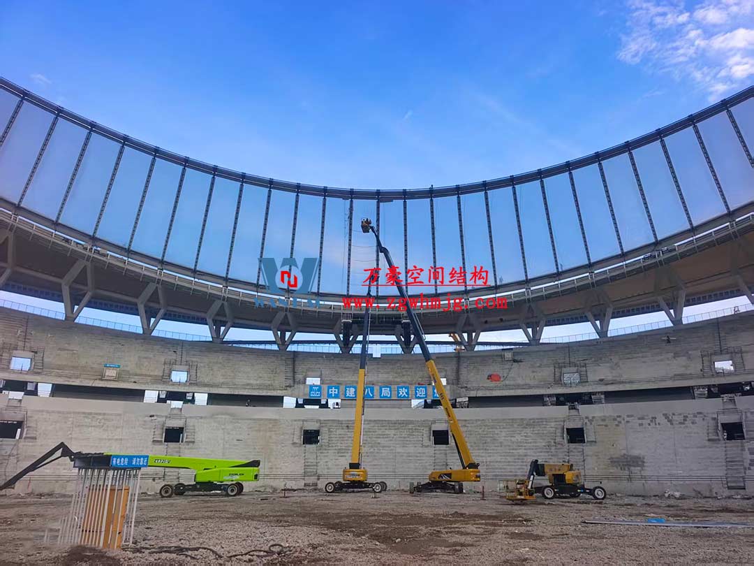該項目采用車輻式索膜結構體系,其中膜結構由屋面內環ETFE氣枕結構、屋面外環PTFE膜結構及立面PTFE膜結構組成。 其中,屋面ETFE氣枕由萬豪空間結構深化設計及安裝,ETFE氣枕投影面積20000平方米左右。