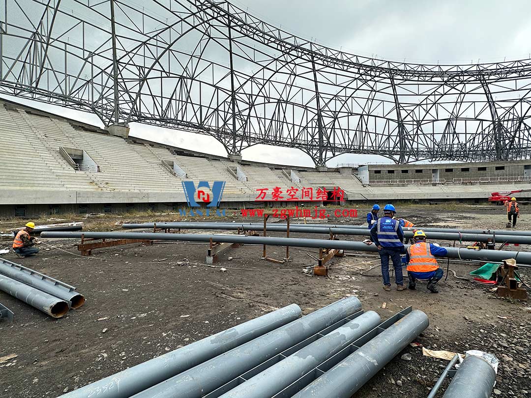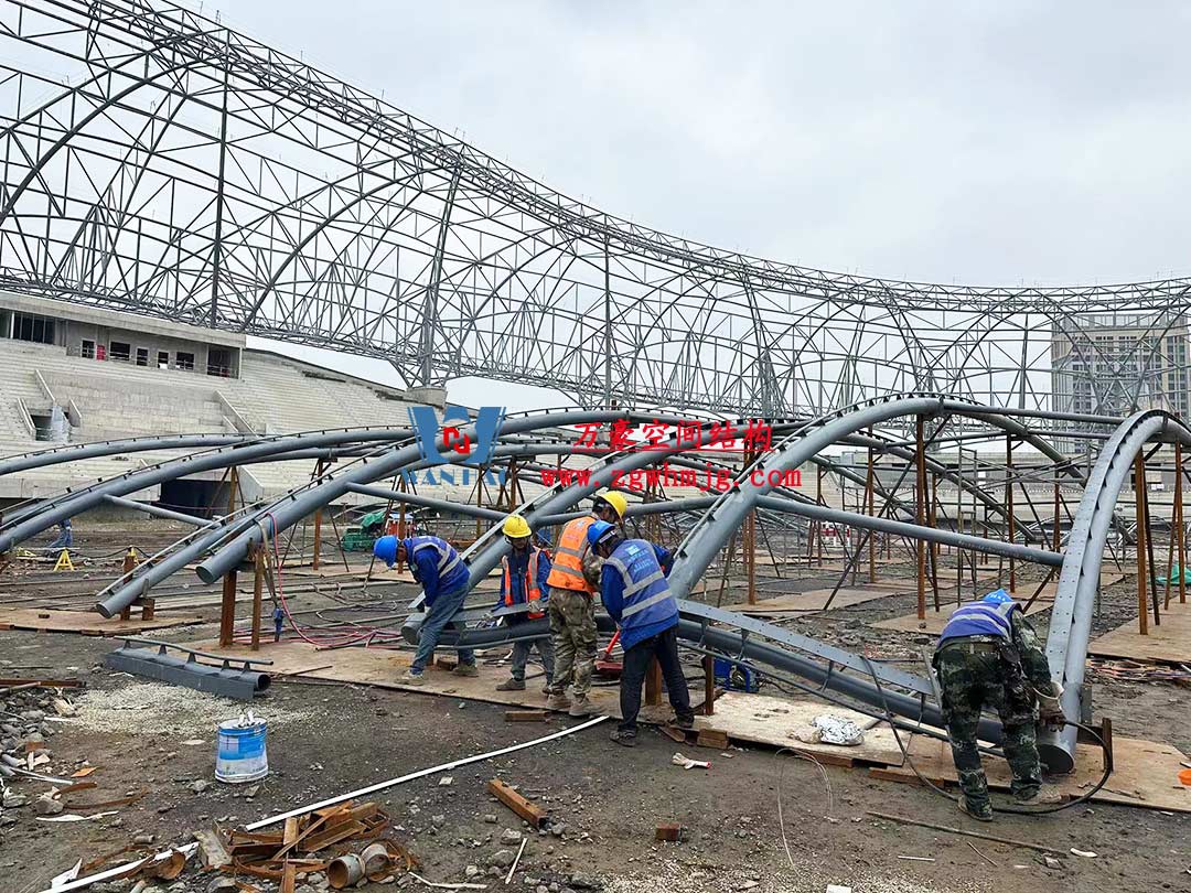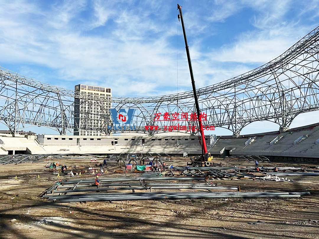 山東蓬萊體育場坐落于煙臺黃渤海新區蓬萊示范區,該體育中心占地約200畝,總建筑面積5.6萬平方米。蓬萊體育場以“漂浮的仙島”為設計理念,運用龍骨優化與雙曲鋁板單元化裝配工藝,以連續曲面構成主體造型,頂部采用雙層PTFE膜材張拉完成,42500平方米流線型穹頂,以靈動曲線呼應黃海波濤