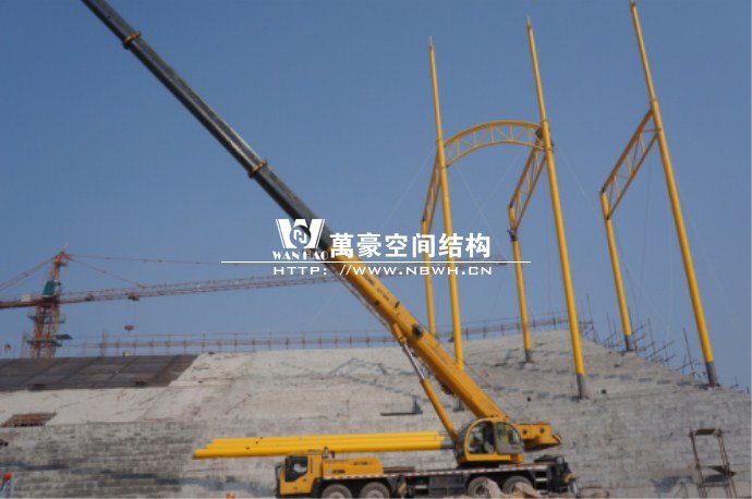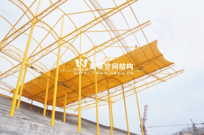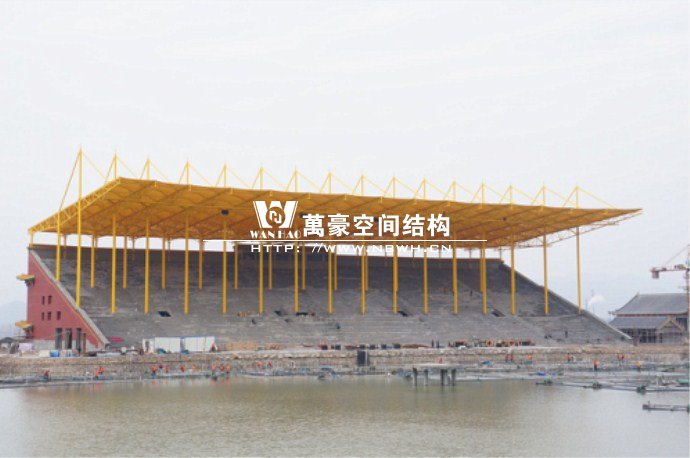 橫店影視城被一圈連綿起伏的山巒包圍著,層疊的遠山宛如水墨畫。圓明新園則位于小鎮西邊的山巒中,芳草萋萋、溪水潺潺!花仙湖膜結構看臺坐落于圓明新園春苑東北角,為骨架支撐式膜結構,建筑面積約為16000㎡,看臺主體結構可分為15個單元,屋面膜結構則由30片膜組成。主體結構劃分為四大部分:鋼柱、主桁架、次桁架和馬道。鋼柱高34.76米,單個重量達8.2噸;主桁架長70.66米,柱間距15米,看臺屋面猶如浮動的金色流云,徜徉在花仙湖上空。此項目為全國最大的“水戲”表演建筑的看臺,同時也是水上樂園彩色膜結構最大的一個景觀。