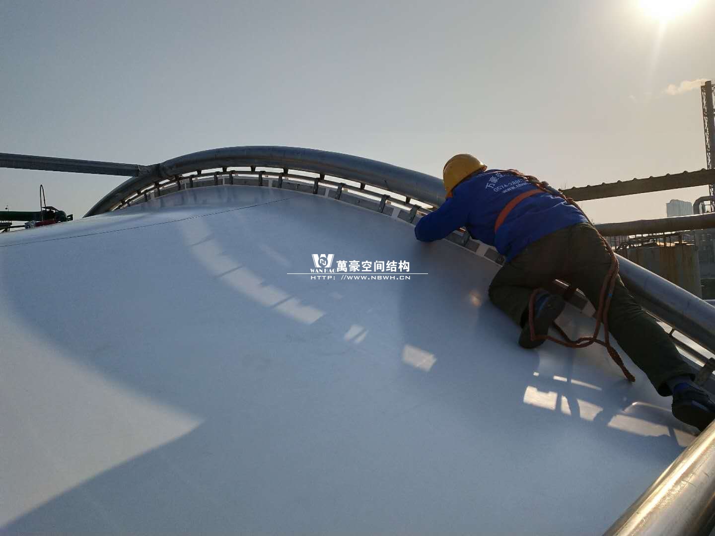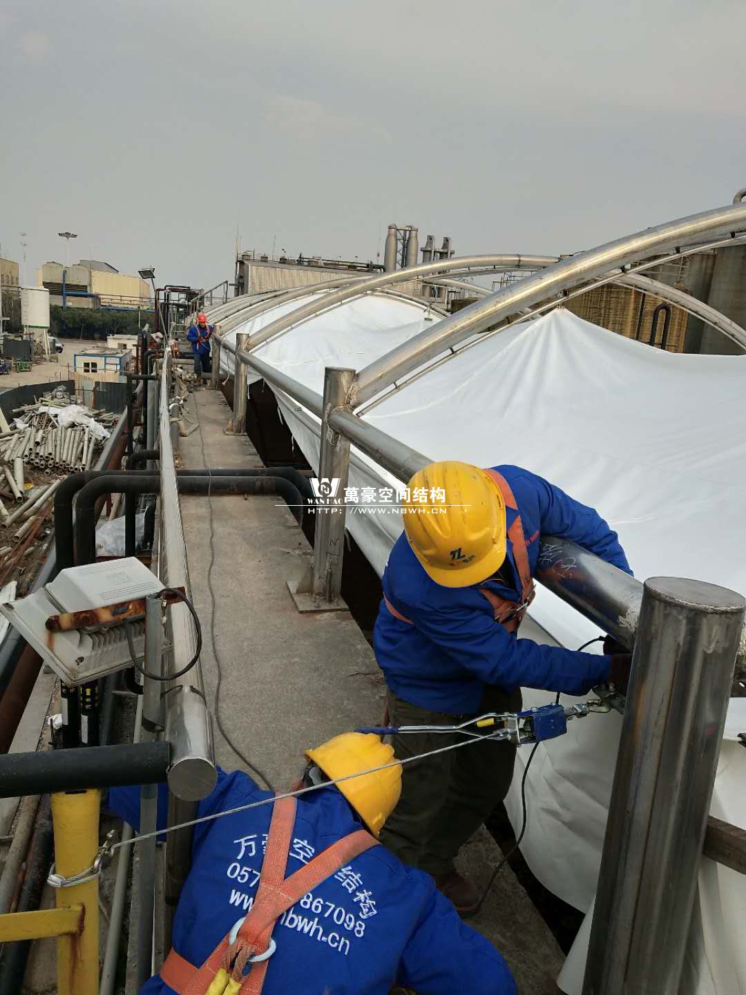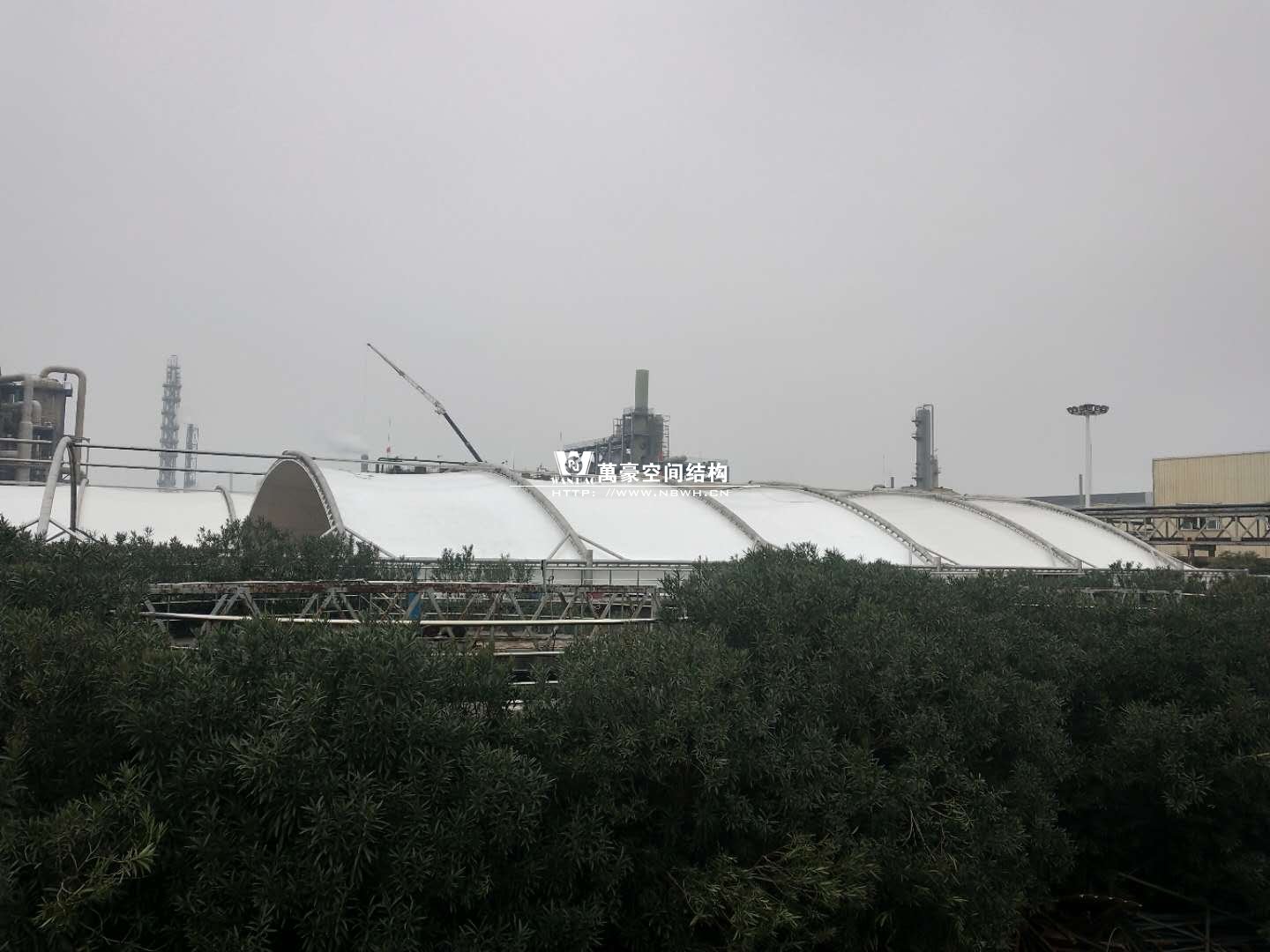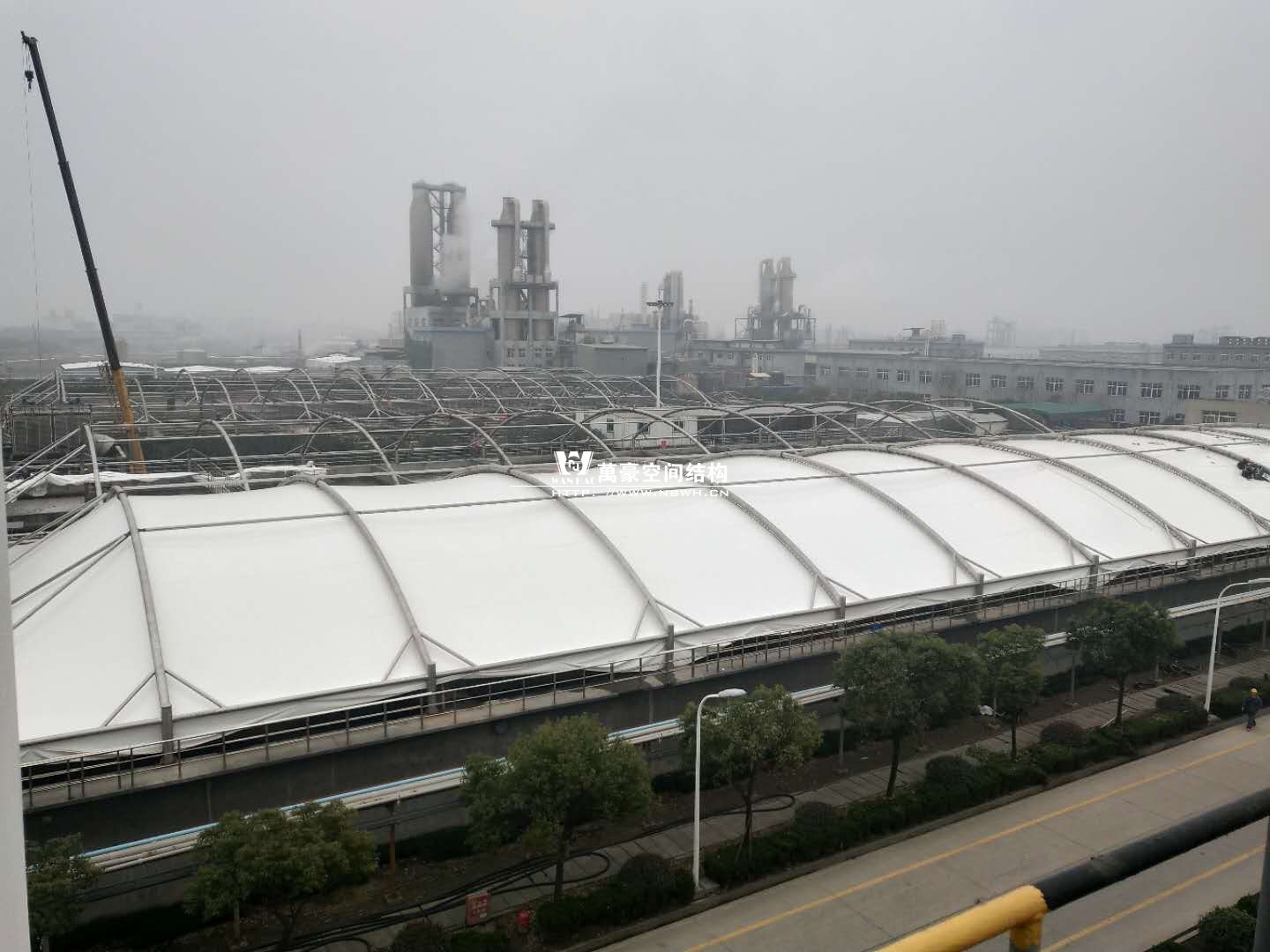 東廠區(qū)生化池加蓋工程,坐落于浙江省紹興市杭州灣上虞經(jīng)濟(jì)開發(fā)區(qū)龍盛科技園內(nèi)。整個(gè)項(xiàng)目由A/O池加蓋4座、二沉池加固定蓋4座、濃縮池加蓋2座、氧化池加蓋1座、氧化氣浮池加蓋1座、氧化集水池加蓋1座、出水調(diào)節(jié)池1座、安諾池1座,共計(jì)15座鋼膜結(jié)構(gòu)組成。總用鋼量達(dá)350噸,總建筑面積達(dá)35000平方米。
