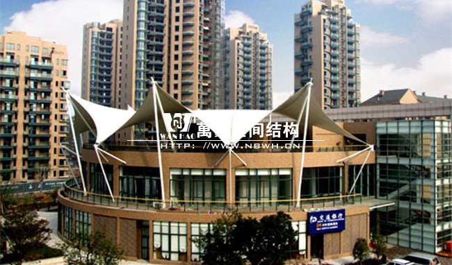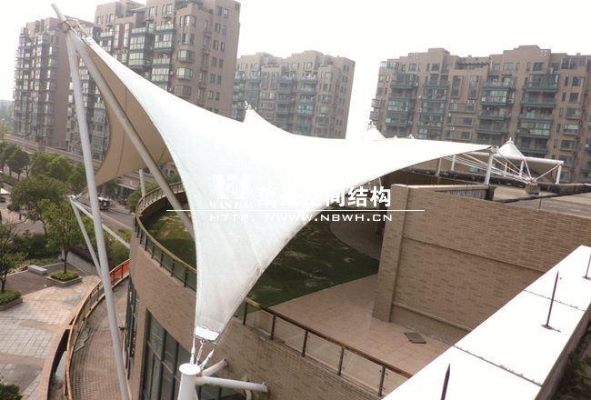 工程屹立在寧波鄞州區(qū)紫郡小區(qū),作為小區(qū)售樓處屋頂景觀,整體工程有8片單體膜組成,每片單體膜展開面積約50平方米,結(jié)構(gòu)造型飄逸輕盈,結(jié)構(gòu)受力有墻體承載,為張拉式膜建筑的典型代表,膜材高低起伏,形如波濤拍岸。極具現(xiàn)代化氣息,和諧的融與環(huán)境,成為商業(yè)小區(qū)的一道亮麗風(fēng)景線。